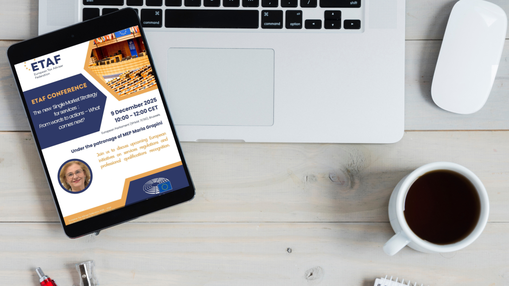 Marți, 9 decembrie 2025, în intervalul 11:00–13:00 (ora României), European Tax Adviser Federation (ETAF) organizează, sub patronajul eurodeputatului Maria Grapini, conferința cu tema Noua strategie privind piața unică a serviciilor – De la vorbe la fapte: ce urmează?.